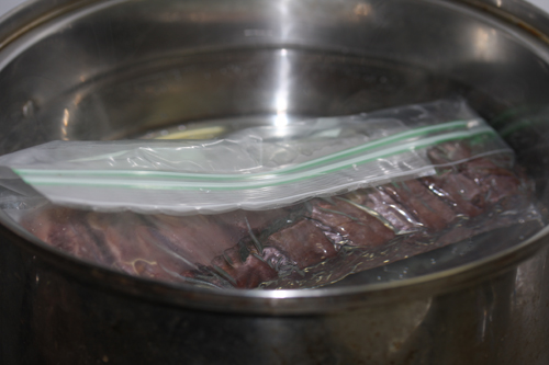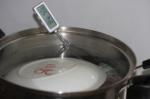 本来そのまま食べるサーロですが、心配なので燻製後、70度位のお湯で1~2時間ジップロックに入れて熱処理します。熱処理後冷蔵庫で2日間寝かせて完成です。手間ですが、これでそのまま食べれます。