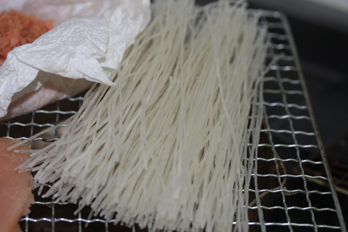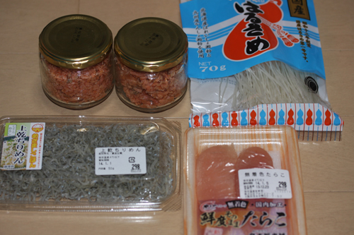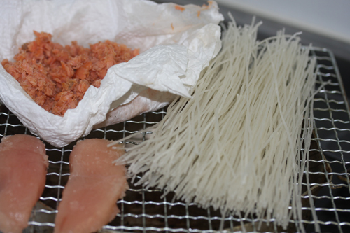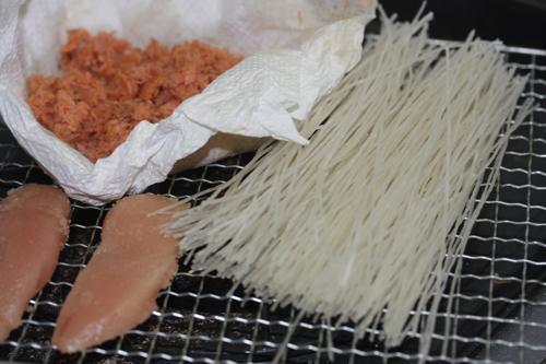 ▼はるさめ、鮭フレーク、明太子、ちりめんじゃこ、スライスハムを準備