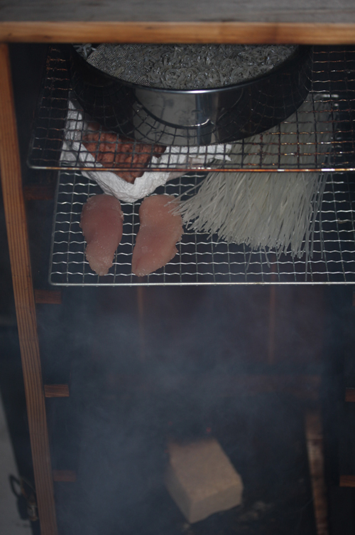 なるべく低温で短時間燻製することで色付きを抑えます。とはいっても夏場だと難しいので温度が高くなってしまったらそれはそれでOKですw。
