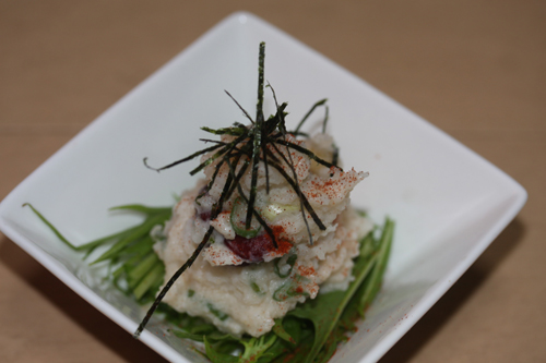 山芋を使い燻製明太子を練り合わせ、 燻製タラモサラダを作りました。これは正直メチャうまでしたw。酒に合いますね!ポイントは濃縮レモン果汁を入れてさわやかスモーキーテイストにする事です~。