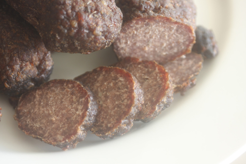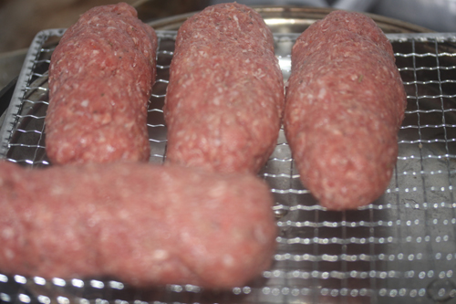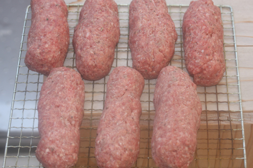 ミンチに塩等を加えてよく捏ねます。あとは手巻き寿司のように綺麗に巻いたり、型に入れて成型してもいいのですが…自分は適当に棒状に成型して冷蔵庫で1日寝かせます。