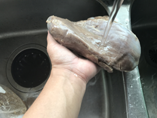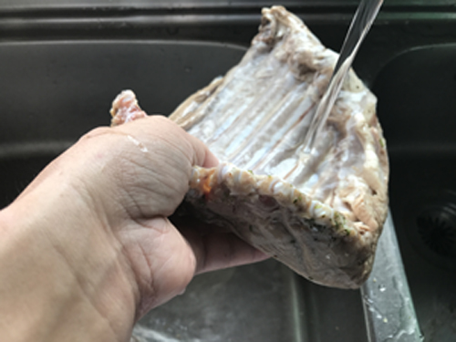 1週間後ジップロックから肉を取り出し軽く水洗い。水をはったボールに入れて、冷蔵庫で8時間程放置し塩抜きをします。