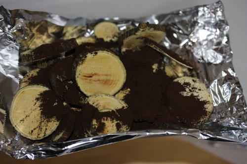 2時間じっくり熱乾燥させると良い感じに脱水出来ます。あとは燻煙するのみ!アルミホイルの上に静岡産のみかんのチップ+ピート少々をブレンドしてイザ燻煙〜