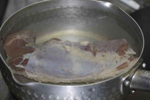 冷蔵庫で寝かす事5~7日間後。豚バラをジップロックより取出し、流水で丁寧に洗した後、水を張ったボールに浸します。