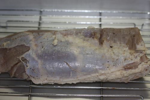 本来これくらいの燻製肉であれば24時間が目安ですが、この日の夜燻煙をしたかったので冷蔵庫で約12時間寝かせる事に。