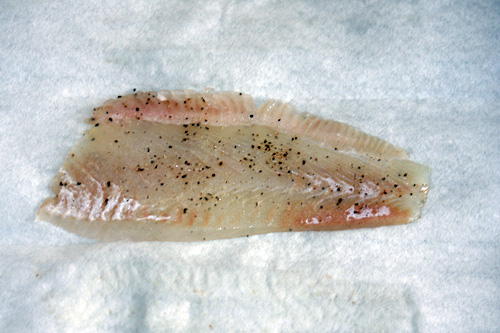 キッチンペーパーに切り身を乗せ、塩とブラックペッパーを両面適量振りかける。塩の量は好みでいいですが、塩抜きしないので加減が分からない場合は、気持ち薄口仕上げで塩をふって下さい。