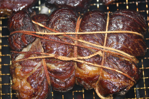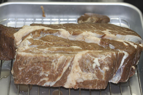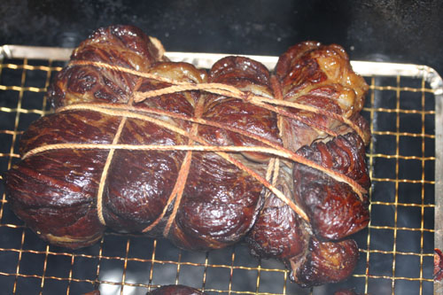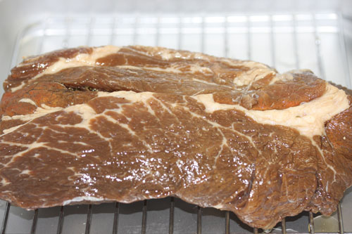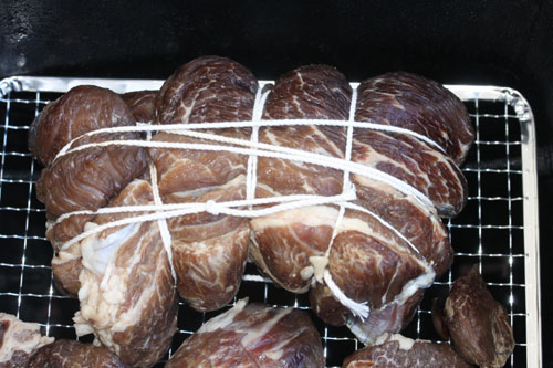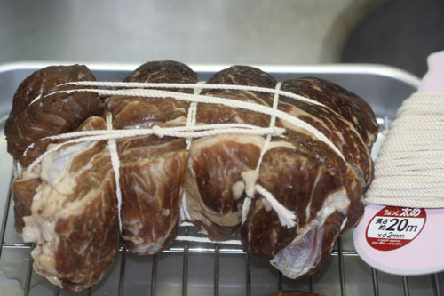 冷蔵庫で1週間寝かせた後肉を取出し、軽く水洗いをします。
