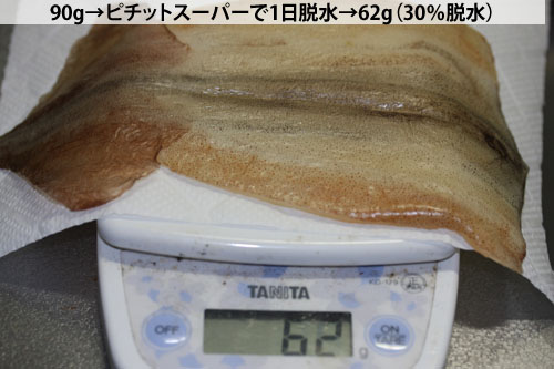 ピチットで脱水する前に計量。重さは90gと39g。▼約30~40%脱水能力。