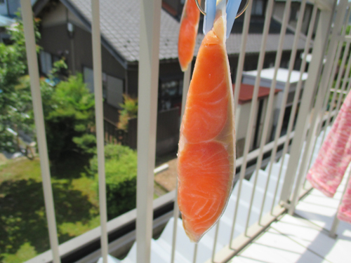 ●サーモンの半身は、切り込みを入れて岩塩を振りかけ、1日冷蔵庫で寝かした後、水洗いし風通しの良い日陰で風乾燥。若しくは冷蔵庫で脱水をして燻製。
