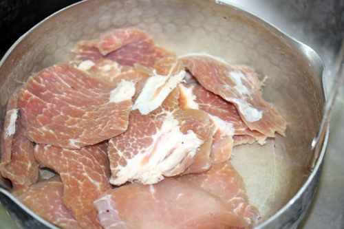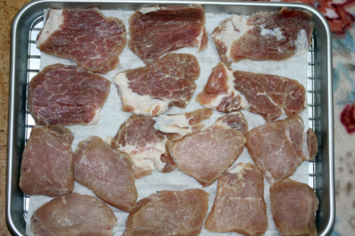 今回も安いアメリカ産の肉を、タイムサービスでさらにお安く購入。ウチには切れる包丁が無いので、スライスしてある肉は便利です。ちなみに左がもも肉。右が肩ロース肉。どちらがポークジャーキーに合うのだろうか!?