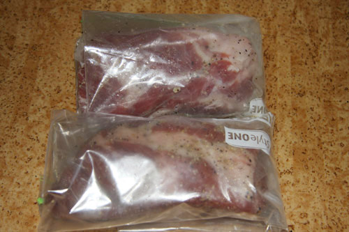 塩&ハーブ&スパイスを擦り込んだらジップロックへ入れ、冷蔵庫で1週間寝かせます。その間一日一回、肉の上下を反転してください。