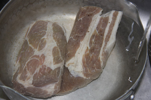 6時間後肉の端を切り落とし、焼いて食べてみる。好みの塩加減ならOK。塩辛い様なら、塩抜き続行。塩抜きが終わったら、風乾燥。冷蔵庫で10時間脱水します。