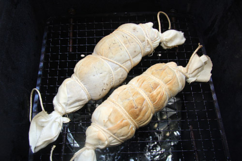 後は風乾燥をして完成。旨みが凝縮されて最高の味わい。市販品では味わえないスモーキーな香りもたまりません。これでうまく行ったら次は、キロ単位のハムを仕込みましょう。