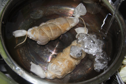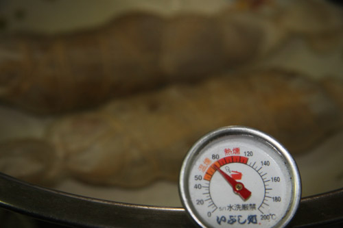 70℃で1時間程茹でる。今回はブロックが小さいため1時間位でOKです。ちなみに温度管理ですが弱火→切り→弱火…の繰り返しで温度調整すれば、ワンルームの部屋に有る様な、ガスコンロでも問題無く出来ます。