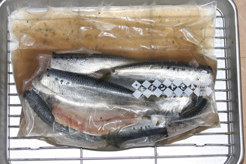 ジップロックにイワシと先程作ったソミュール液を入れ、冷蔵庫で5時間程(最低1時間)ソミュール漬けします。