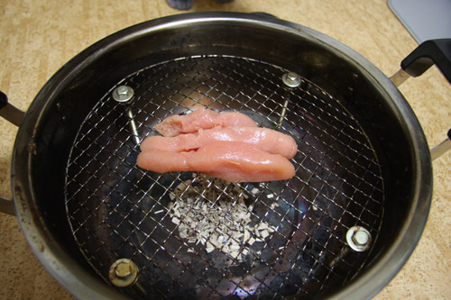 ココで一番気をつける事は燻製チップを入れたらタラコを入れない状態で蓋をして、煙が出る迄強火で燻します。煙が充分出始めたら弱火若しくは火を一旦消してタラコ投入。