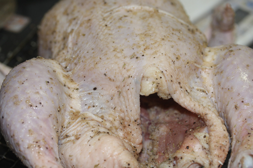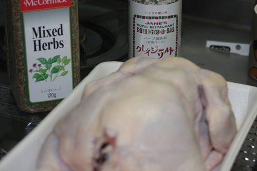 ・上記記載の分量で塩等をすり込む。ちなみに今回はクレイジーソルトを使用。これはかなり便利です。スーパーでも売っているので、あれこれ味付けを考えるのが面倒な方には、おススメ。