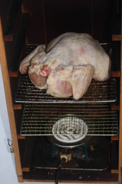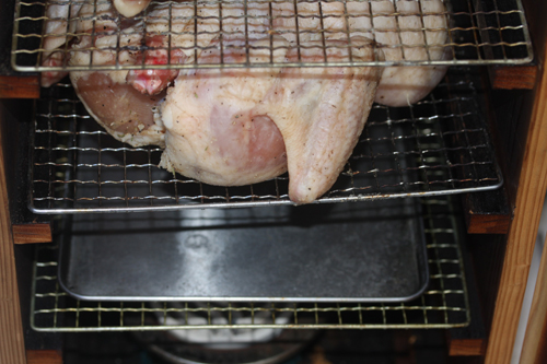 時短で作るなら熱乾燥を、燻製器でしないでオーブンを使って、最初180℃で1時間。燻製後の熱乾燥を220℃で30分程度してください。