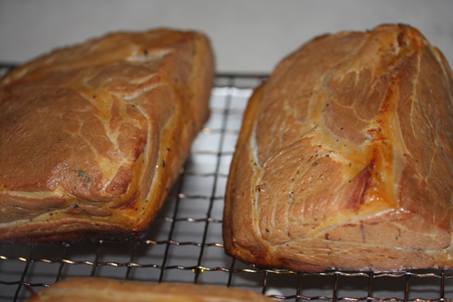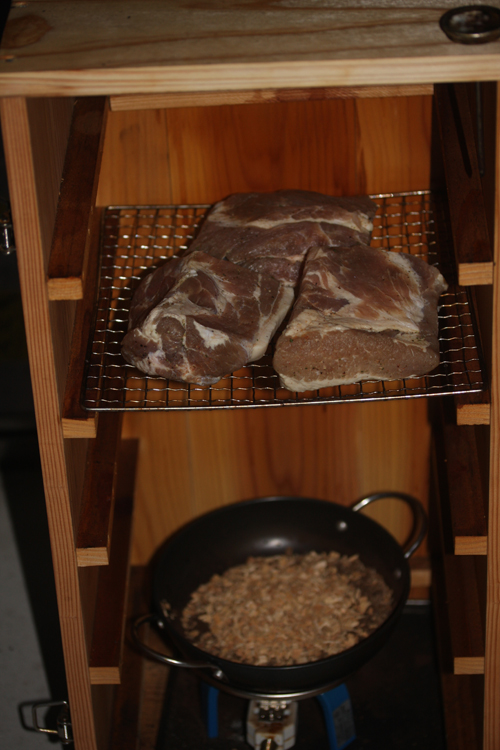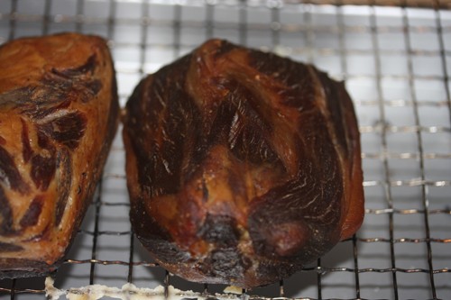 今回は燻製後の写真を見て分かるように、燻製前の風乾燥がイマイチ(雨が降ったため乾燥が不十分)。燻製後の味見では、酸味が強く最低の仕上がりでした。いかに燻製前の脱水処理が重要かと、思い知らされました。