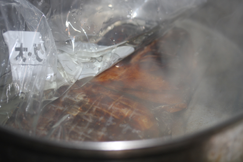 燻製終了後ロース肉はハムにするので1時間程放置し70~75℃のお湯で1.5時間ほど熱処理。落し蓋等をすると便利です。※温度計必須!