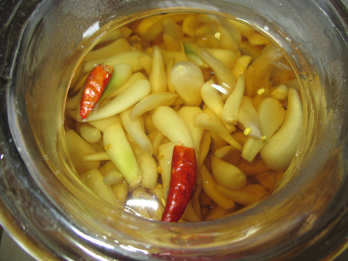 ラッキョウの重さの半分の砂糖を準備。あとは米酢を入れて2ヶ月で完成。お好みで鷹の爪。