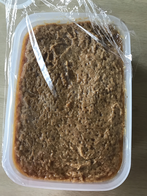 粕漬は酒粕800gに三温糖300g+ザラメ100gをブレンド。これにスモークチーズをスライスし漬け込みます。タッパー等に入れて、冬場なら常温で、夏場なら冷蔵庫で1ヶ月寝かせます。