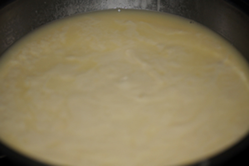 ゆっくり溶かしながら入れてもいいのですが、自分は面倒なので1㎏一気に入れて、オタマで攪拌します。チーズが溶けてきたら火を消します。