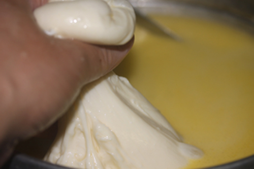 この時点ではチーズは、かなりトロトロですが、水分を出し冷めていくにつれ、手でつかめる硬さになっていきます。