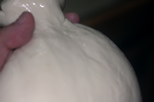 業務用のモッツァレラを熱湯で温めて、ストレッチさせて、ひょうたん型を作り➡冷却➡塩漬け➡吊るして乾燥➡完成。以上です。
