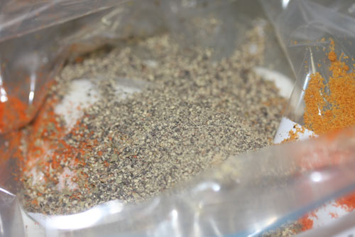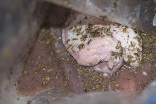 上記ソミュール材料をジップロックへ入れシェイク。手が一切汚れなくて楽です。軽く肉を揉んで冷蔵庫へ。1週間寝かせます。