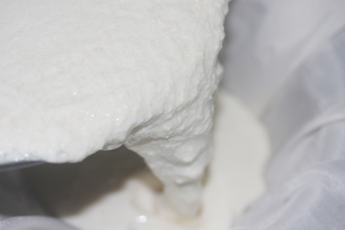 牛乳で作る時より早く凝固しています。カードの量も多いですね。大豆ってやっぱり、タンパク質の塊なんですね。とりあえず軽くカードを切りながら、ホエーの排出を促した後、布で濾します。