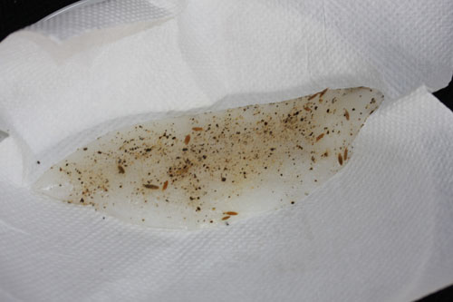 紋甲イカをキッチンペーパーでしっかり拭き取り、塩を好みの量全体に振る(量の目安は、自分が目玉焼きにかけるくらいの感覚で、振って下さい。つまり適量)後は必要であれば、好みのハーブやらスパイスを全体に振りかけて下さい。その後冷蔵庫で最低1時間乾燥させます。